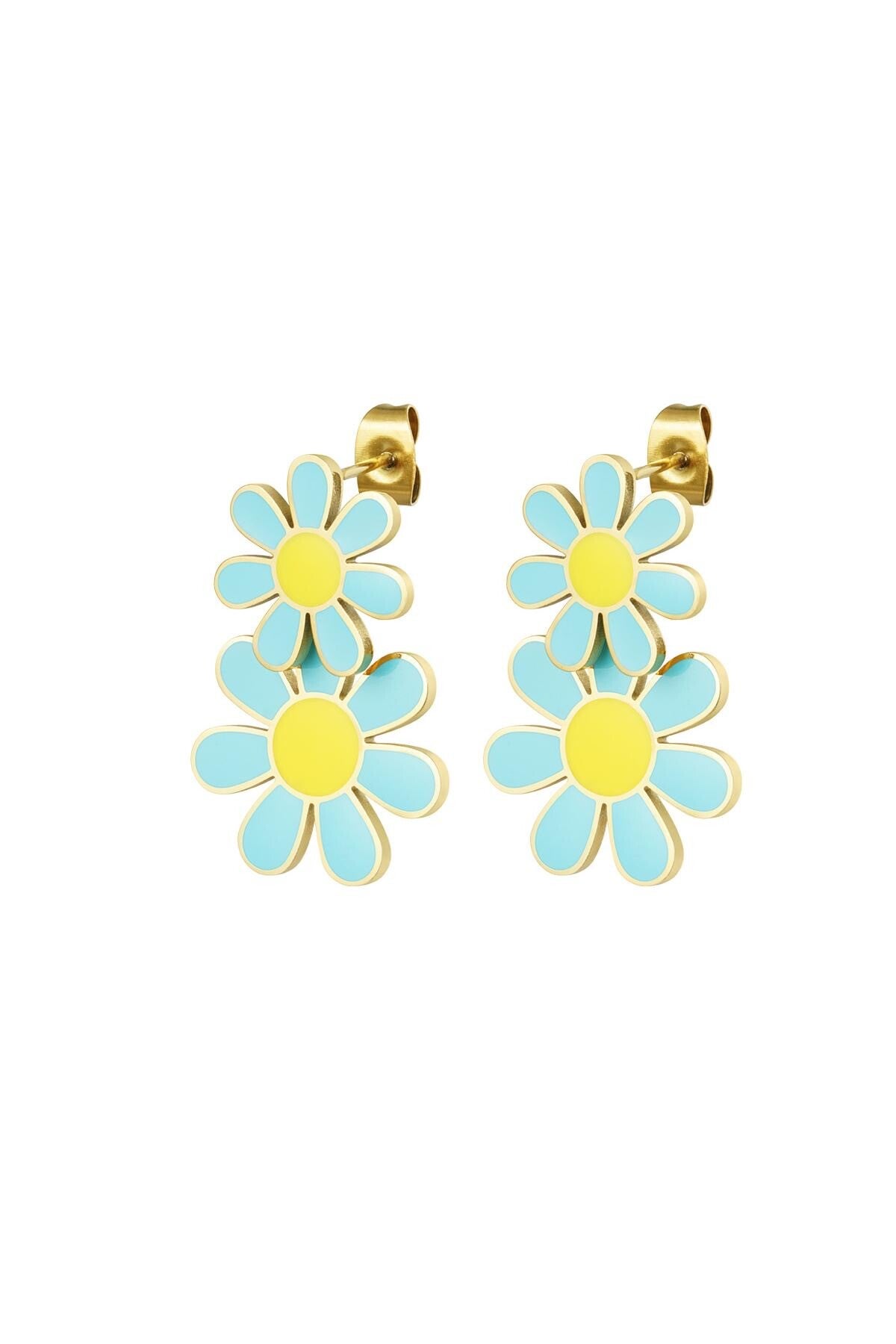 Krijg een Summer Vibe met deze vrolijke goud kleurige oorbellen met 2 grote bloemen in de voorjaarskleuren kleuren blauw & geel