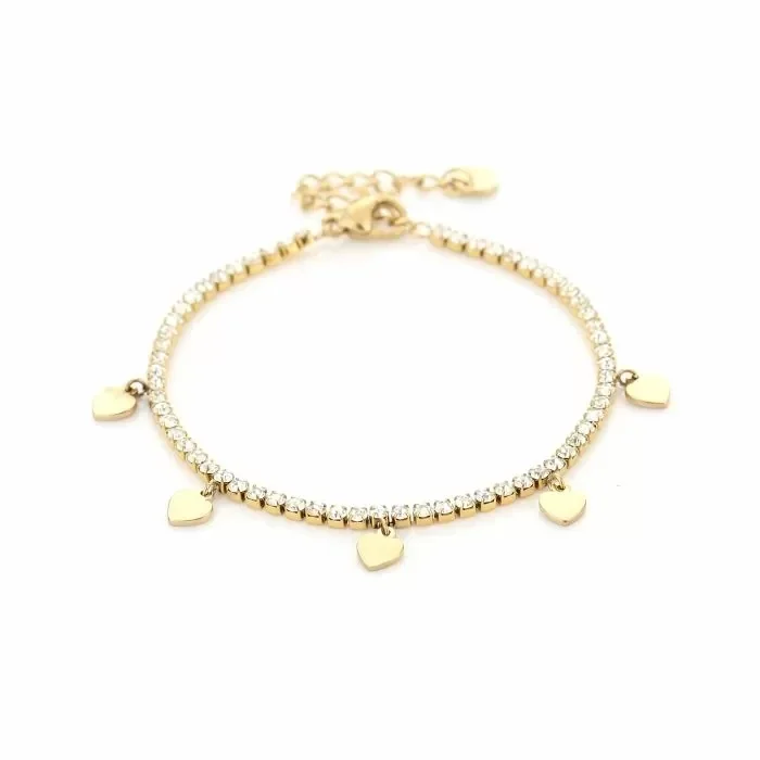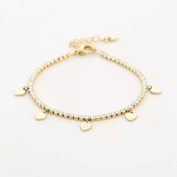 Stijlvolle armband bezet met schitterde strass steentjes en hangende hartjes